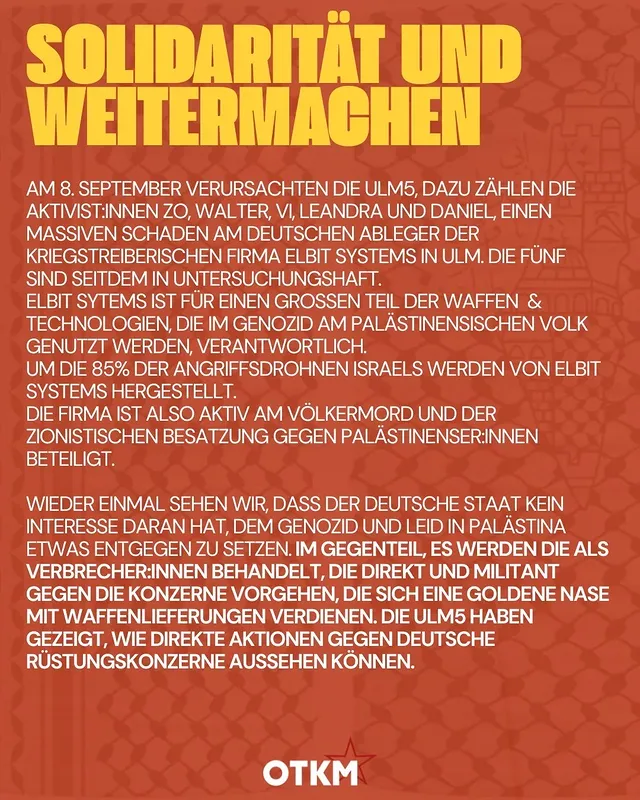 Am 8. September verursachten die Ulm5, dazu zählen die Aktivist:Innen Zo, Walter, Vi, Leandra und Daniel, einen massiven Schaden am deutschen Ableger der kriegstreiberischen Firma Elbit Systems in Ulm. Die fünf sind seitdem in Untersuchungshaft.