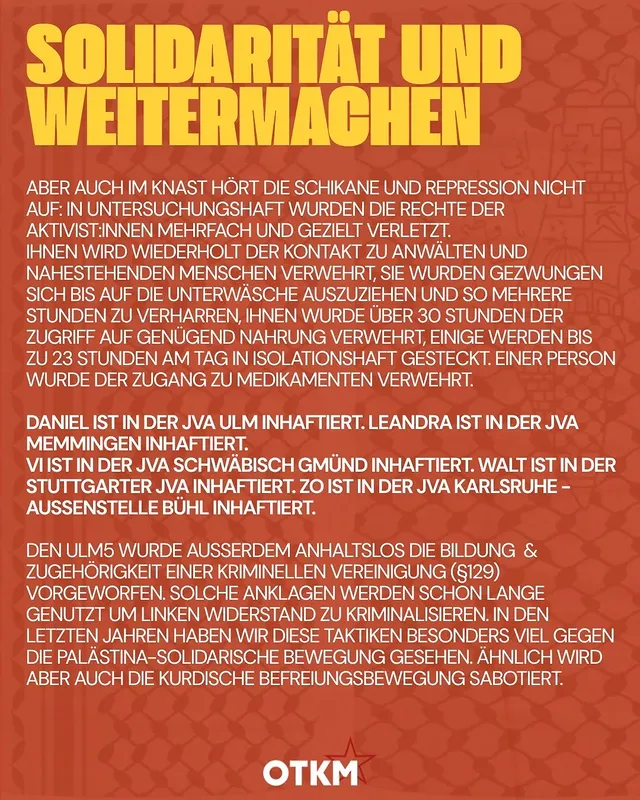 Den Ulm5 wurde außerdem anhaltslos die Bildung und Zugehörigkeit einer kriminellen Vereinigung (§129) vorgeworfen. Solche Anklagen werden schon lange genutzt um linken Widerstand zu kriminalisieren. In den letzten Jahren haben wir diese Taktiken besonders viel gegen die palästina-solidarische Bewegung gesehen.