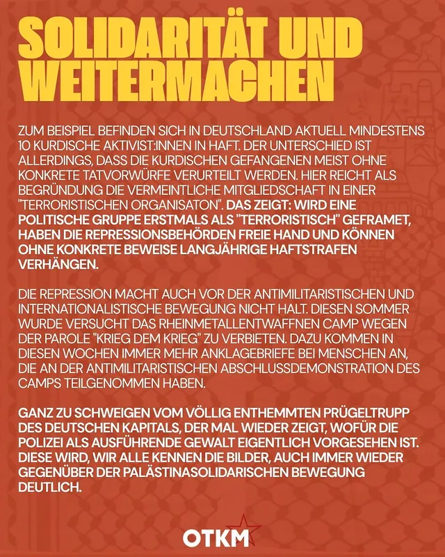 Die Repression macht auch vor der antimilitaristische und internationalistische Bewegung nicht Halt. Diesen Sommer wurde versucht das RheinmetallEntwaffnen Camp wegen der Parole „Krieg dem Krieg“ zu verbieten. Dazu kommen in diesen Wochen immer mehr Anklagebriefe bei Menschen an, die an der antimilitaristischen Abschlussdemonstration des Camps teilgenommen haben. Ganz zu schweigen vom völlig enthemmten Prügeltrupp des deutschen Kapitals, der mal wieder zeigt, wofür die Polizei als ausführende Gewalt eigentlich vorgesehen ist. Diese wird, wir alle kennen die Bilder, auch immer wieder gegenüber der palästinasolidarischen Bewegung deutlich.
