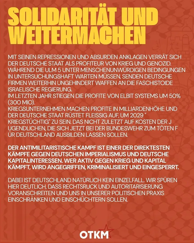 Wieder einmal sehen wir, dass der deutsche Staat kein Interesse daran hat, dem Genozid und Leid in Palästina etwas entgegen zu setzen. Im Gegenteil, es werden die als Verbrecher:Innen behandelt, die direkt und militant gegen die Konzerne vorgehen, die sich eine goldene Nase mit Waffenlieferungen verdienen. Die Ulm5 haben gezeigt, wie direkte Aktionen gegen deutsche Rüstungskonzerne aussehen können.