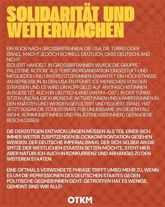 Dabei ist Deutschland natürlich kein Einzelfall. Wir spüren hier deutlich, dass Rechtsruck und Autoritarisierung voranschreiten und uns in unserer politischen Praxis einschränken und einschüchtern sollen. Ein Blick nach Großbritannien, die USA, die Türkei oder Israel, macht jedoch schnell deutlich, dass Deutschland nicht isoliert handelt. In Großbritannien wurde die Gruppe „Palestine Action“ als Terrororganisation eingestuft und Mitglieder und Unterstützer:Innen erwartet ein Höchstmaß an Repression. In den USA entführt ICE Menschen von den Straßen und es wird ein Kopfgeld auf Antifaschist:innen ausgesetzt, auch in Deutschland (Antifa-Ost). In der Türkei sitzen unzählige Aktivist:Innen und Kämpfer:innen in den Knästen und werden gefoltert und isoliert. Israel beschließt sehr wahrscheinlich die Todesstrafe für unliebsame Gefangene(in diesem Fall wohl Kommunist:Innen und Palästinenser:Innen).