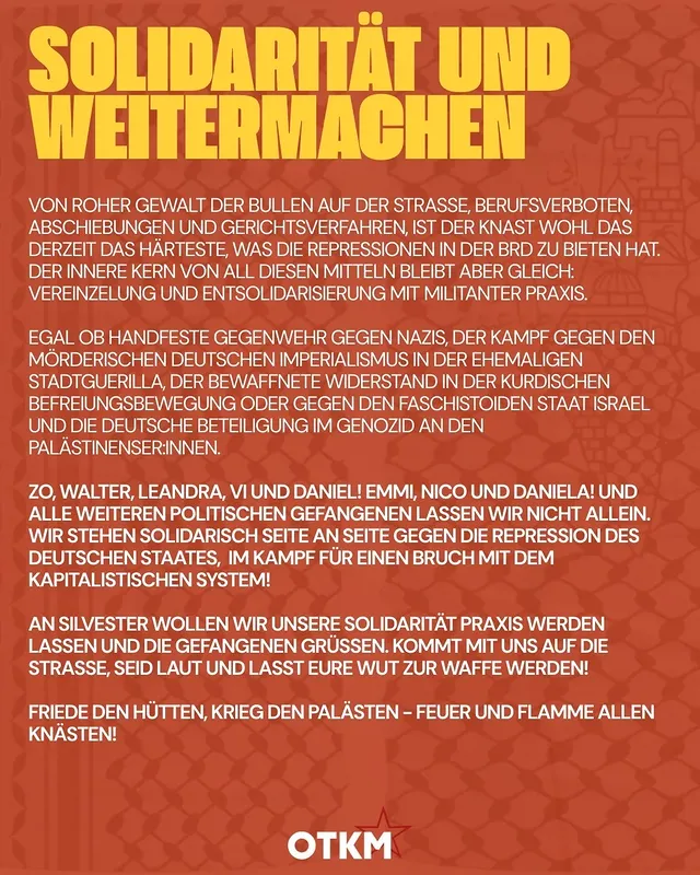 Zo, Walter, Leandra, Vi und Daniel! Emmi, Nico und Daniela! Und alle weiteren politischen Gefangenen lassen wir nicht allein. Wir stehen solidarisch Seite an Seite gegen die Repression des deutschen Staates und im Kampf für einen Bruch mit dem kapitalistischen System!
